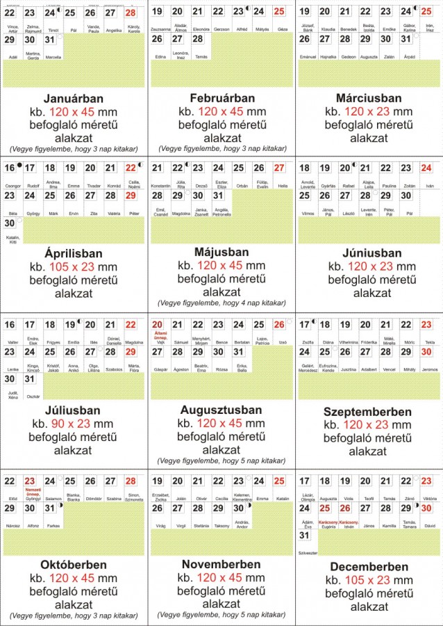 | Szabad terület a naptárrácsban, havi bontásban | |||||||||||||||||||||||||||||||||||