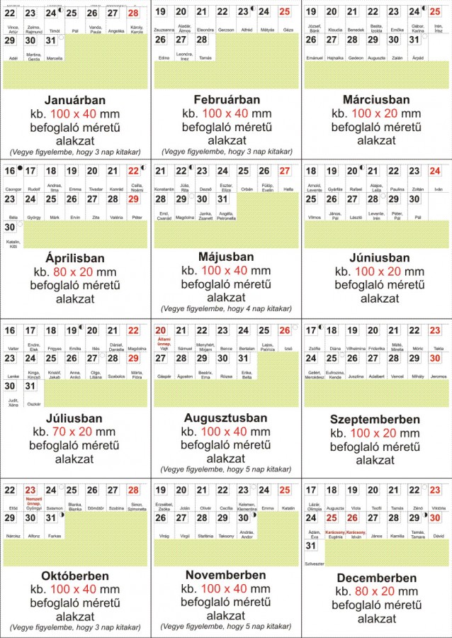 Szabad terület a naptárrácsban, havi bontásban | |||||||||||||||||||||||||||||||||||||||||||||