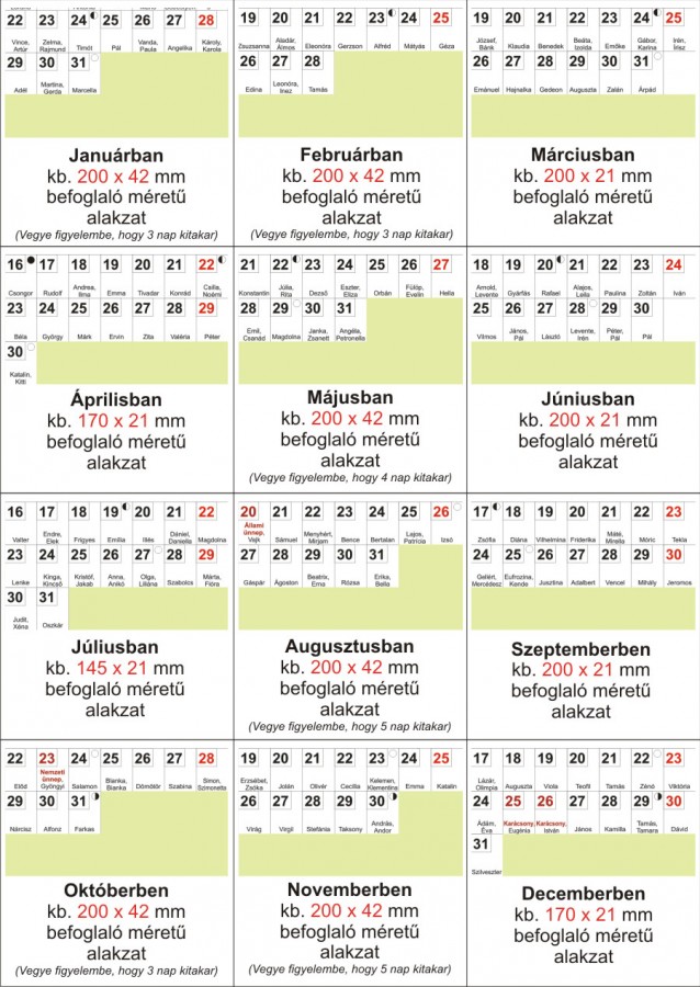 | Szabad terület a naptárrácsban, havi bontásban | |||||||||||||||||||||||||||||||||||